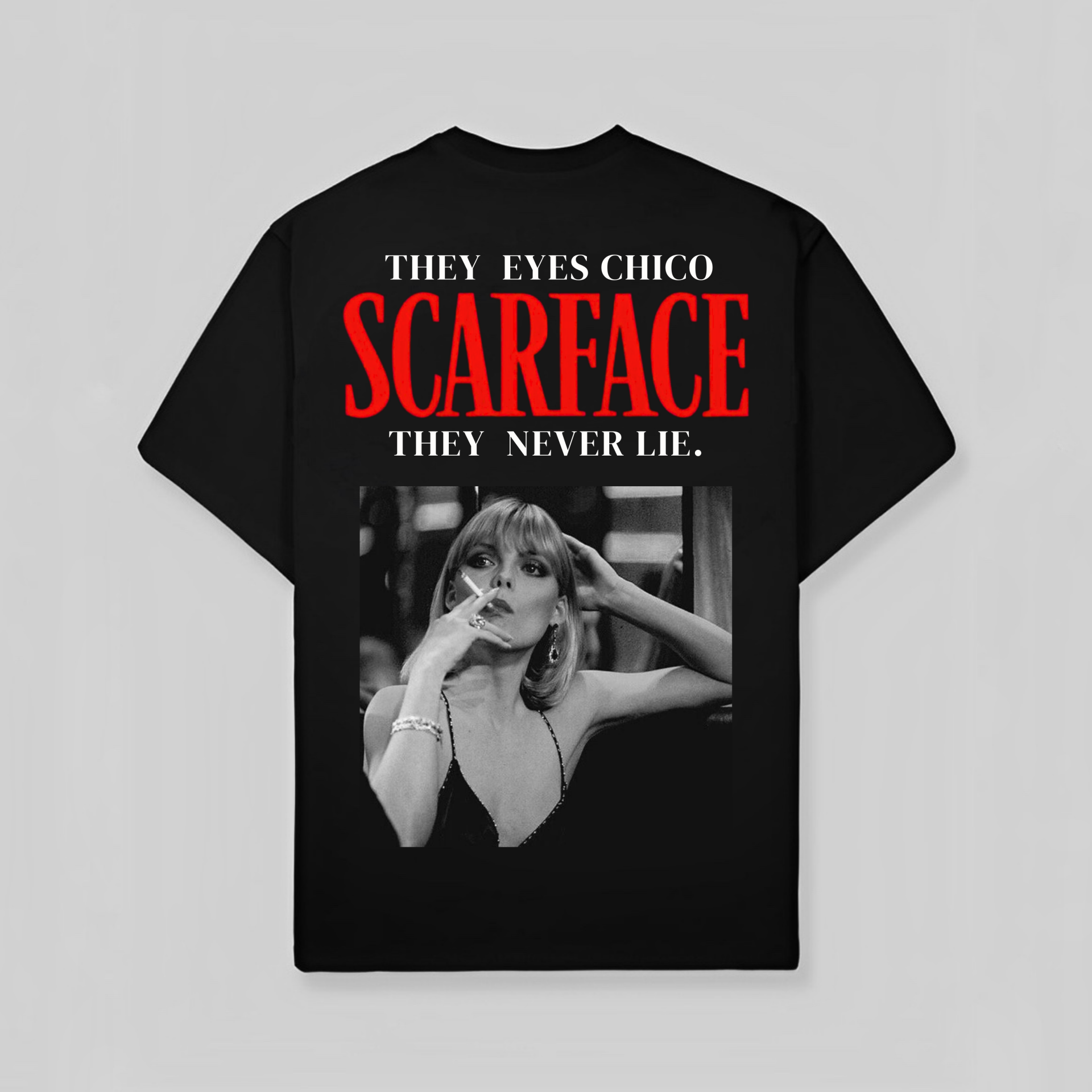 Lleva contigo el espíritu rebelde y la determinación de Tony Montana con esta playera que refleja tu pasión por el cine y los personajes icónicos. Conviértete en el centro de atención con este diseño que combina arte y moda.